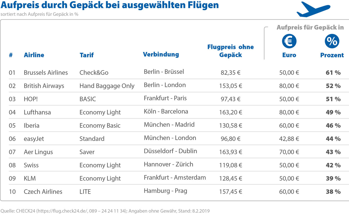 Bei den betrachteten Beispielflügen verteuern Gepäckgebühren den Ticketpreis um bis zu 61 Prozent. Ein Reisender zahlt für einen Flug von Berlin nach Brüssel und zurück ohne Gepäck 82 Euro, für den ersten Koffer werden zusätzlich 50 Euro fällig.
